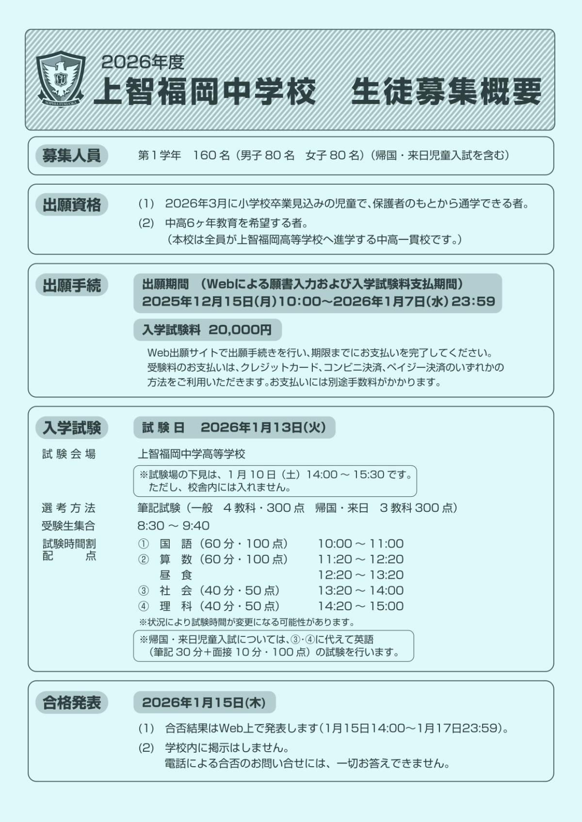 このたび、2026年度入試に向けて配布し本校ホームページにも掲載しておりました「2026年度 上智福岡中学校 生徒募集概要」の内容に誤りがございました。