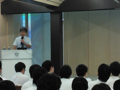今日は、同志社大学から2名の講師が来られて、大学の説明をしてくださいました。1人は理工学部エネルギー機械工学科の田中達也教授、もう1人は本校の卒業生で61期の川嶋君でした。新島襄は理学士の資格を取って帰国し、同志社英学校に続き、同志社ハリス理化学校を作ったそうです。研究設備の整った素晴らしい大学の説明がありました。