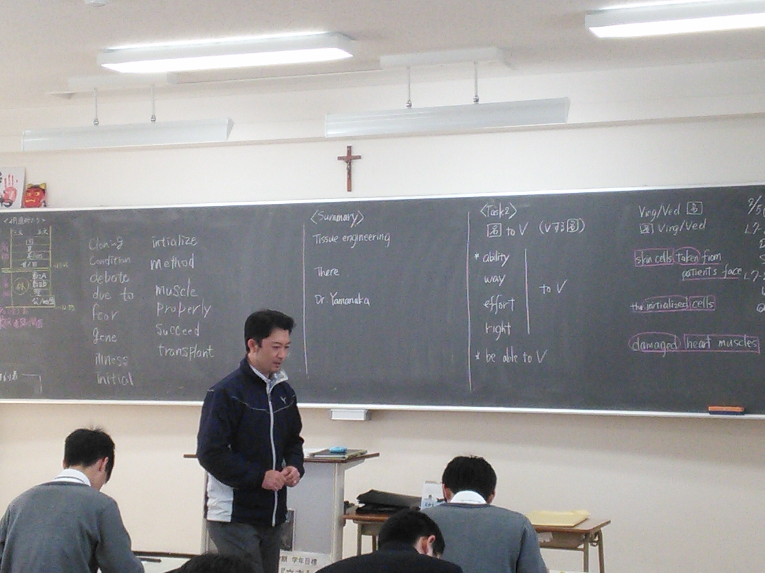 本校の英語科には毎学期上智大学の吉田研作教授が指導に来てくださいます。時代の要請に応え、上智福岡の英語教育は4技能(読む、書く、聞く、話す)をバランス良く伸ばすカリキュラムに変わっています。今日の研究授業でも、教師が英語で指示を出し、生徒は自分で考えた英語で受け答えしていました。